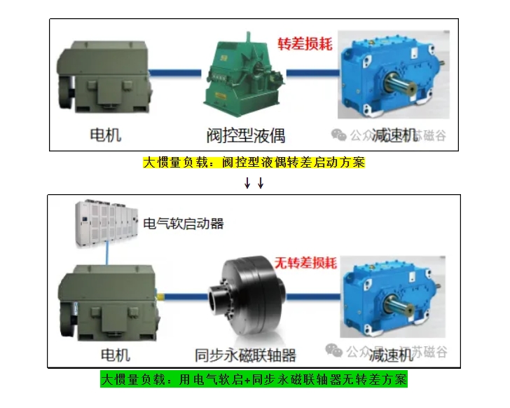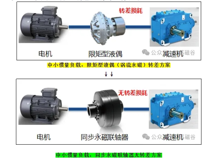 風(fēng)機水泵平方轉(zhuǎn)矩類用液力偶合器或渦流永磁調(diào)速器調(diào)速,電機功率1000kW,調(diào)速比i=80%,轉(zhuǎn)差損耗功率= (80%^2 - 80%^3)*1000 = 63.5kW;按年工作8000小時,電費0.6元/度計算,年耗電費=63.5*8000*0.6=304800(元) 據(jù)估算,(1) 用于緩沖沖擊保護(hù)配套有阻尼類緩沖液力偶合器每年轉(zhuǎn)差損耗為478億千瓦時;(2) 用于風(fēng)機、水泵負(fù)載轉(zhuǎn)差調(diào)速過程每年產(chǎn)生的轉(zhuǎn)差損耗為560億千瓦時;合計轉(zhuǎn)差損耗478+560=1038億千瓦時,占比2022年中國工業(yè)領(lǐng)域電機總用電量3.98萬億千瓦時2.68%。相當(dāng)三峽發(fā)電全年的發(fā)電總量。 【解決緩沖轉(zhuǎn)差損耗策略1】 中小轉(zhuǎn)動慣量負(fù)載優(yōu)先采用無轉(zhuǎn)差彈性緩沖方式啟動和運行。