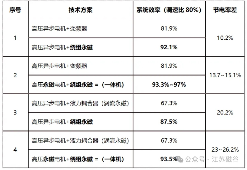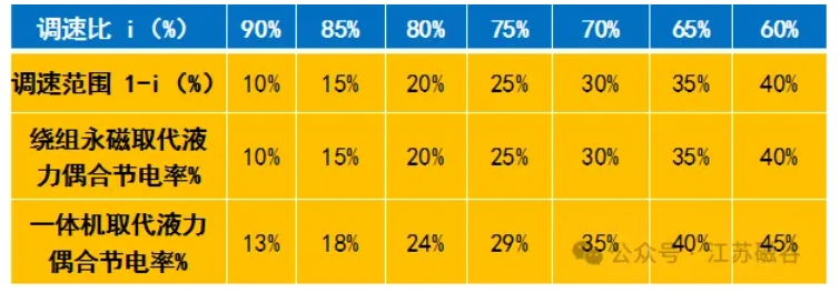 【繞組永磁調(diào)速高節(jié)電性能】 繞組永磁調(diào)速的原理就是將發(fā)熱轉(zhuǎn)差功率用永磁轉(zhuǎn)差發(fā)電技術(shù)來回收轉(zhuǎn)差能量。繞組永磁調(diào)速具有高節(jié)電性能:永磁一體就是將永磁電機和繞組永磁調(diào)速器嵌套集成的雙永磁調(diào)速電機。 1)繞組永磁調(diào)速同工況取代液力偶合調(diào)速器節(jié)電率見下表: