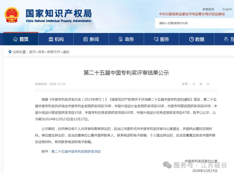 正值2025年元旦佳節,江蘇磁谷迎來了一個振奮人心的消息:公司自主研發的《繞組式無刷耦合傳動裝置》發明專利榮獲中國專利獎優秀獎。這一殊榮不僅為公司的科技創新征程增添了輝煌篇章,更為新年的啟航注入了澎湃動力與無限可能。 中國專利獎,由國家知識產權局攜手世界知識產權組織共同設立,乃我國專利領域的至高榮譽,其評選標準嚴苛,強調知識產權的創造、保護與應用,對激發技術創新、驅動經濟高質量發展具有深遠影響。